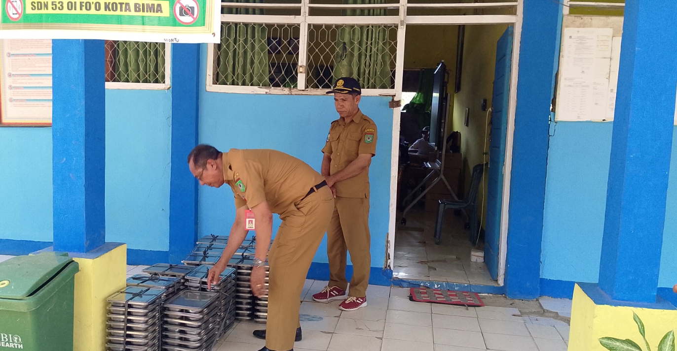 Kepala Dinas Kota Bima Drs. H.Mahfud, M.pd Sedang Memeriksa Menu MBG Saat Berkunjung di SDN 53 Oi Fo'o