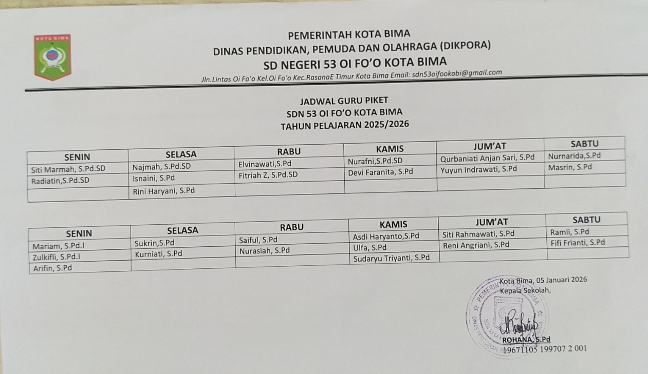 Kota Bima - Sekolah Dasar Negeri (SDN) 53 Oi Fo'o telah mengumumkan jadwal guru piket tahun pelajaran 2025/2026, yang akan berjalan mulai hari Senin hingga Sabtu secara bergantian. Tujuan pelaksanaan piket selama enam hari adalah untuk meningkatkan keamanan dan kenyamanan siswa serta mendukung aktivitas ekstrakurikuler yang diadakan pada hari Sabtu.