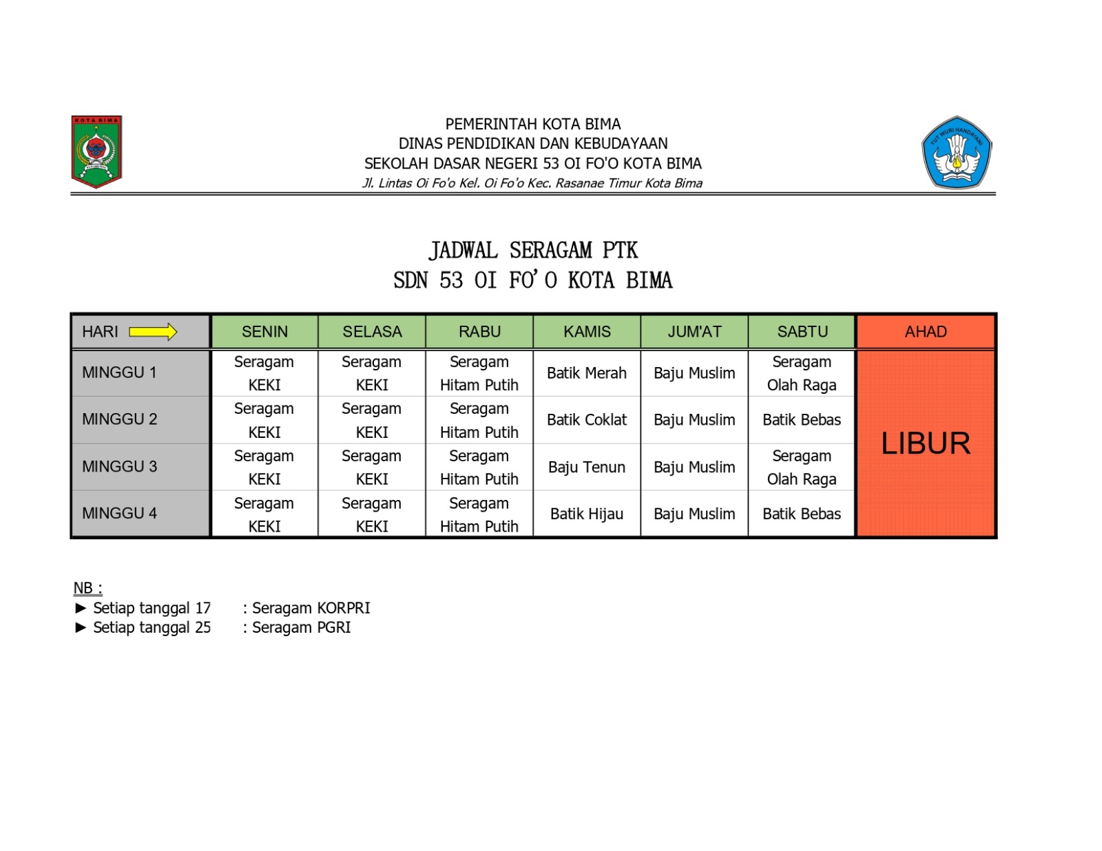 JADWAL SERAGAM PTK SDN 53 OI FO,O KOTA BIMA